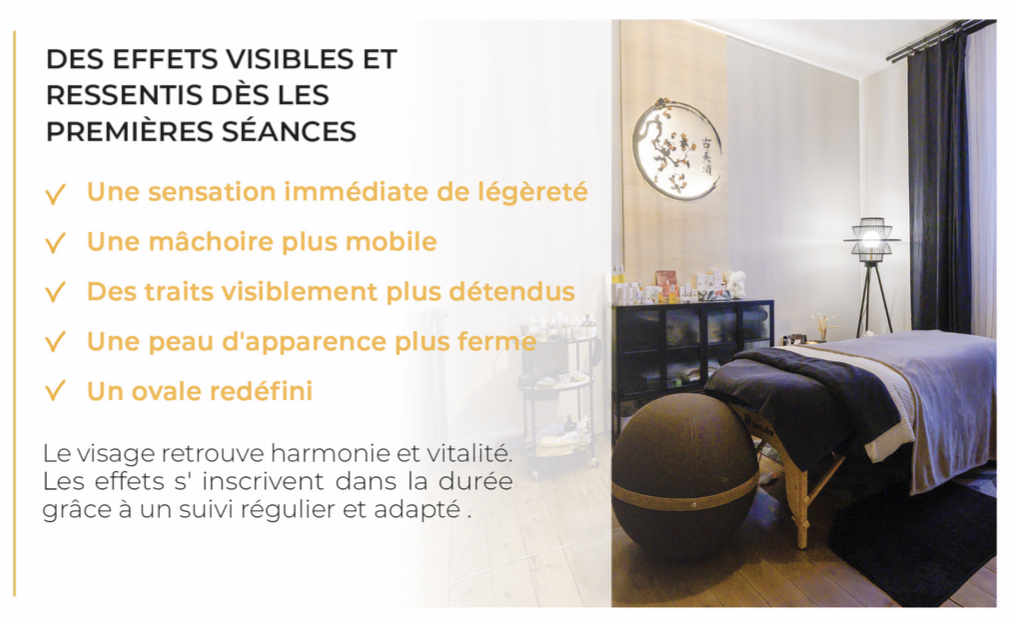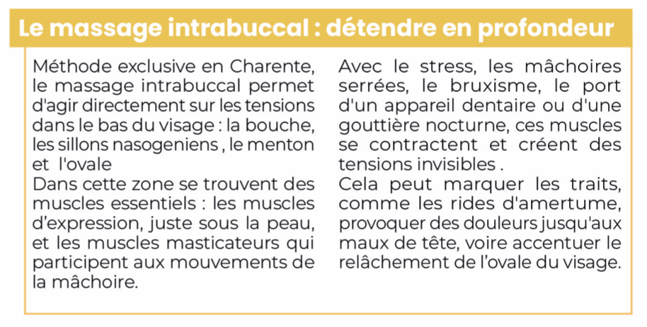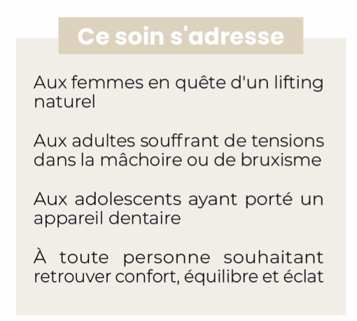 de la bouche avec des gants, cette technique permet de relâcher en douceur ces tensions, mais également de tonifier les muscles permettant ainsi de redonner au visage des contours plus